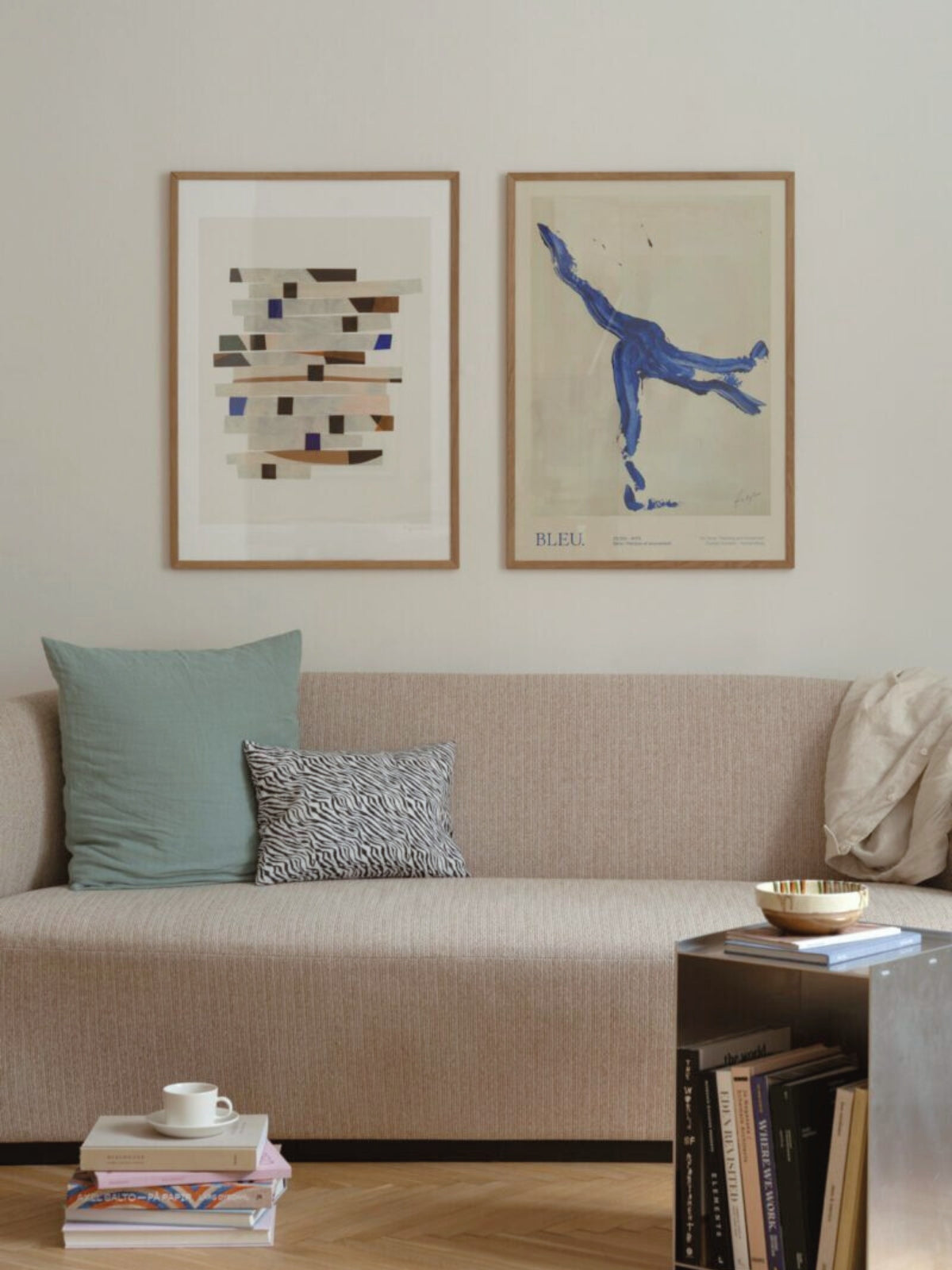 Bleu is part of a Perfect Pair where muted colours blend harmoniously on your walls. One print features geometric shapes in subdued hues, while the other balances with organic shapes in perfect blue.