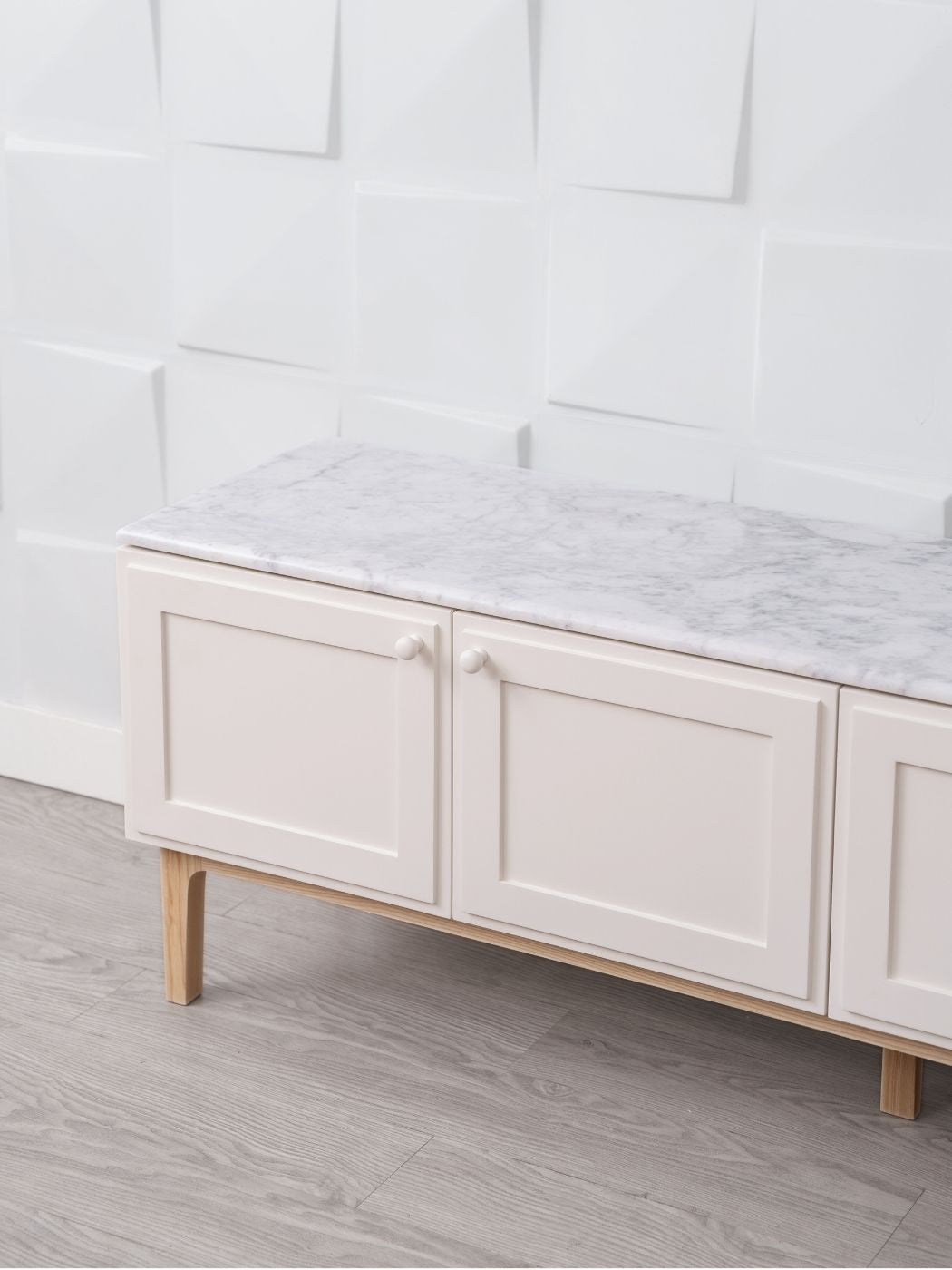 A classy cabinet which made by ash wood legs and coated with industrial pastel color. Its retangular shape comes with marble top which gives a timeless feel to any scene with it. It also has an adjustable shelf behind the right door panel.