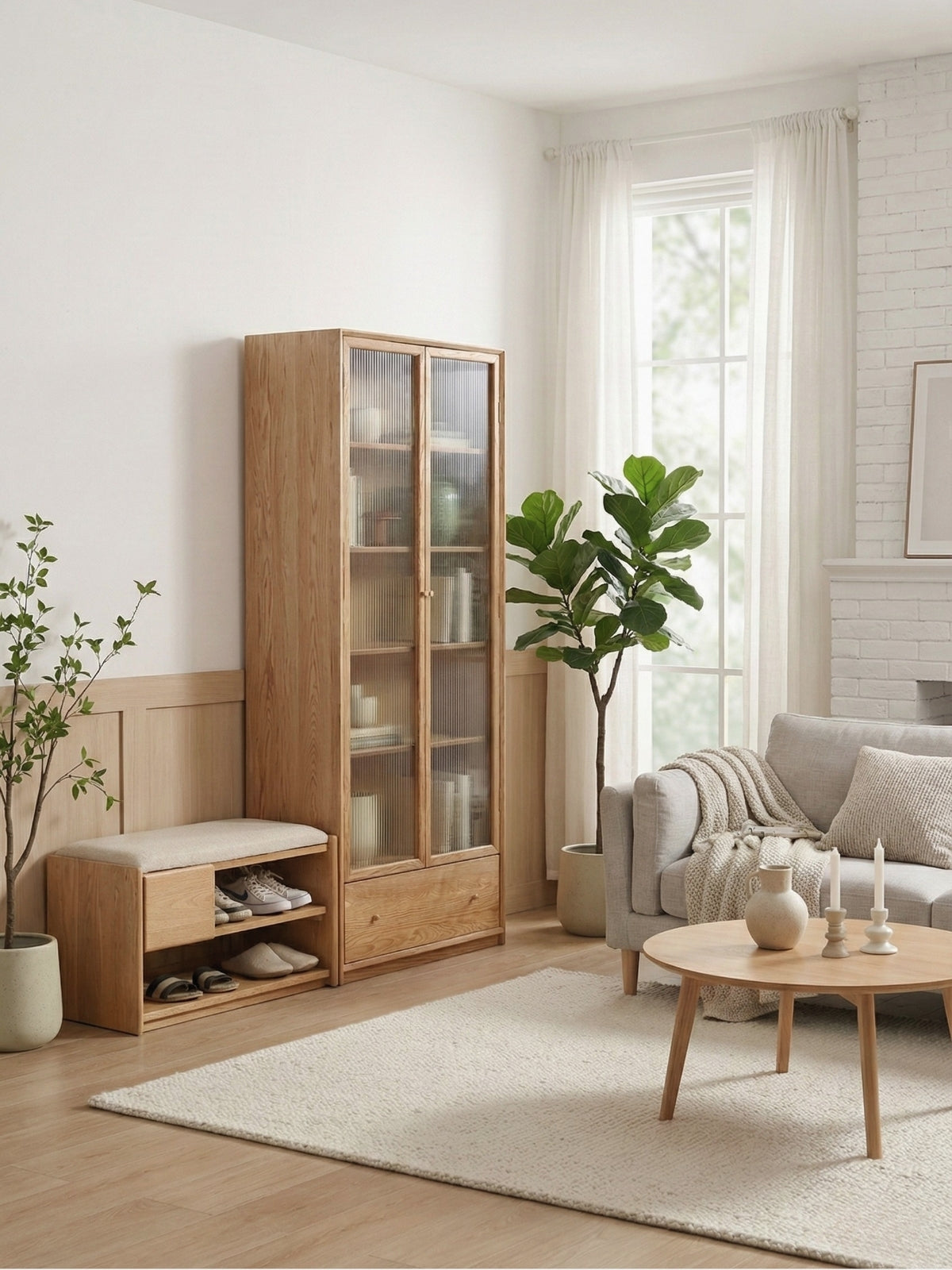 The Natural American Oak Wood Entryway Bench offers premium functionality and style.