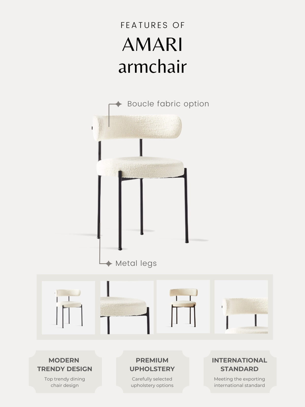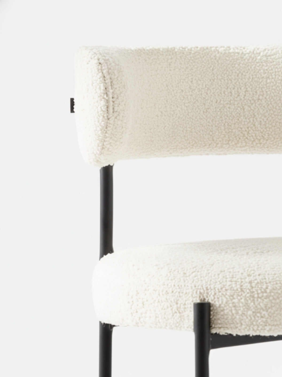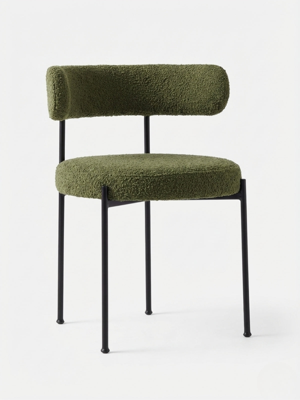 The softly curved backrest offers ergonomic support, while the seat is upholstered in premium Bouclé fabric and generously filled with silk cotton and high-resilience sponge. Its slim metal legs, crafted from seamlessly welded steel, are finished with high-temperature electrostatic powder coating—ensuring long-lasting durability and a sleek matte look. The seat structure is built with durable multi-layer solid wood panels for everyday strength. A timeless piece crafted for modern dining.